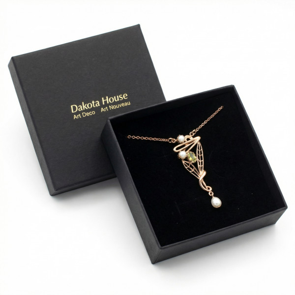 Elegante Jugendstil Halskette neu gefertigt aus 925 Silber, rosé vergoldet und leicht patiniert mit einem Besatz aus einem Peridot und zwei SWZ Perlen sowie einer Abhängung mit einer SWZ Perle. Der Anhänger ist etwa 50 mm hoch. Die gestreckte Länge des Colliers beträgt 42 cm mit einer Verlängerungsmöglichkeit auf 45 cm. Die Lieferung erfolgt in ansprechender Schmuckbox mit Lacktasche.